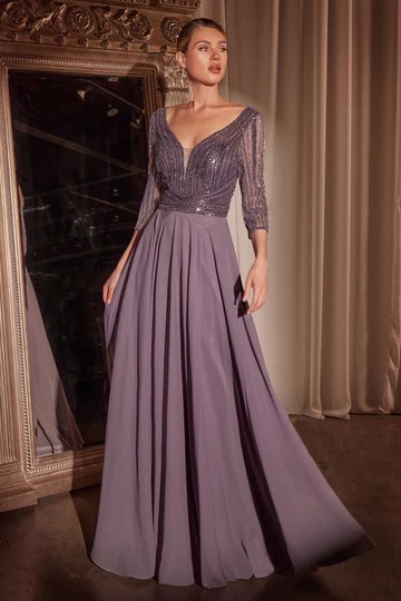 This A-line dress combines timeless elegance with thoughtful details, featuring a deep V-neckline and long sleeves that accentuate its refined silhouette. The intricately beaded bodice offers shimmering sophistication, balanced by a flowing chiffon skirt for graceful movement. Perfect for mothers of the bride or formal occasions, this gown embodies a harmonious blend of beauty and modesty.